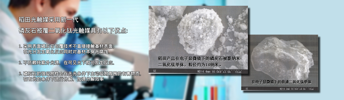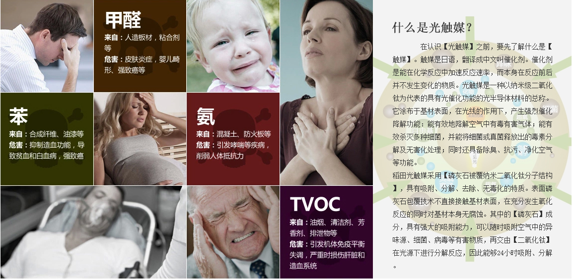 在認(rèn)識(shí)【光觸媒】之前,要先了解什么是【觸媒】。觸媒是日語(yǔ),翻譯成中文叫催化劑。催化劑是能在化學(xué)反應(yīng)中加速反應(yīng)速率,而本身在反應(yīng)前后并不發(fā)生變化的物質(zhì)。光觸媒是一種以納米級(jí)二氧化鈦為代表的具有光催化功能的光半導(dǎo)體材料的總稱。它涂布于基材表面,在光線的作用下,產(chǎn)生強(qiáng)烈催化降解功能:能有效地降解空氣中有毒有害氣體;能有效殺滅多種細(xì)菌,并能將細(xì)菌或真菌釋放出的毒素分解及無害化處理;同時(shí)還具備除臭、抗污、凈化空氣等功能。 稻田光觸媒采用【磷灰石被覆納米二氧化鈦分子結(jié)構(gòu)】,具有吸附、分解、去除、無毒化的特質(zhì)。表面磷灰石包覆技術(shù)不直接接觸基材表面,在充分發(fā)生氧化反應(yīng)的同時(shí)對(duì)基材本身無腐蝕。其中的【磷灰石】成分,具有強(qiáng)大的吸附能力,可以隨時(shí)吸附空氣中的異味源、細(xì)菌、病毒等有害物質(zhì),再交由【二氧化鈦】在光源下進(jìn)行分解反應(yīng),因此能夠24小時(shí)吸附、分解
